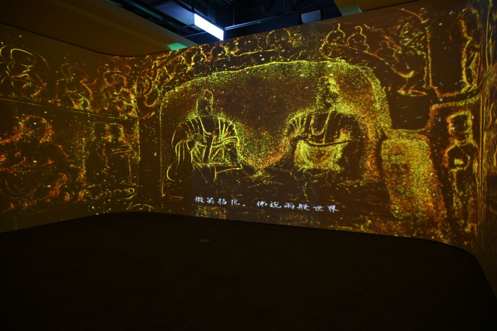 敦煌石窟藝術以數位動畫在展場內呈現,其中莫高窟第285窟,講述古印度時有五百個強盜為非作亂,被官兵圍剿、接受酷刑,最後受佛陀度化、強盜皈依、入山修行、參禪入定等八個場景的因緣故事,在有形及無形的體現中,不僅教導人們放下屠刀,立地成佛的佛教思想,同時帶動了善的循環。這樣的數位呈現,是非常引人注目。
