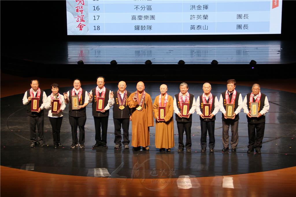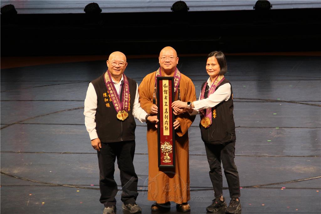 圖說:中華傳統宗教總會總會長心保和尚(中),頒獎予宮廟邀約前10名幹部,大家都獲得佛光山開山祖師星雲大師的新春祝福「和諧共生·馬到成功」。圖/人間社記者李生鳳