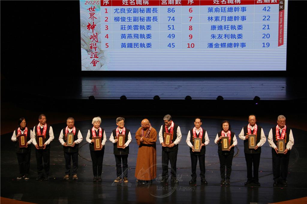 祕書長陳和順工作報告,2025世界神明聯誼會創下多項紀錄,1100家宮廟參加,其中147家宮廟連率9年以上參與,首次加入宮廟220家,代表著神明聯誼會的凝聚力與擴大。以及湧入12萬人次、直播逾10萬人次點閱。112尊千順將軍大會師紀錄空前,也完成了星雲大師的心願。