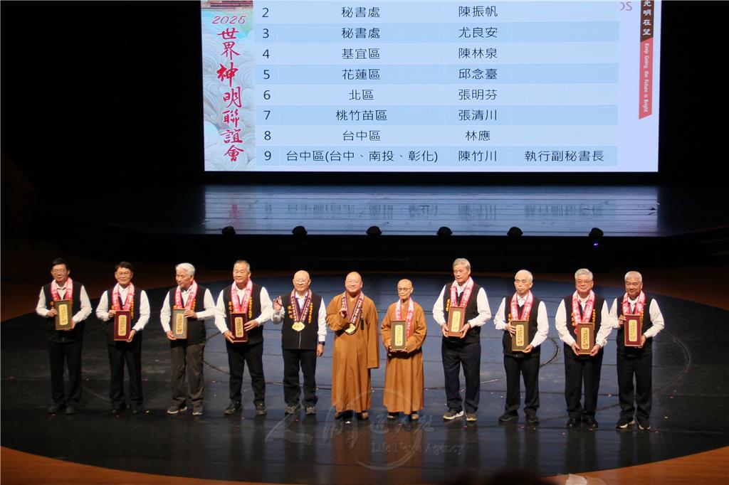 隨後2026年度工作報告和頒獎。心保和尚頒發宮廟邀約前10名幹部,以及陳和順、顧問戚品淑,各區副祕書長等幹部、喜慶樂團和鑼鼓隊等,大家都獲得佛光山開山祖師星雲大師的新春祝福「和諧共生‧馬到成功」。