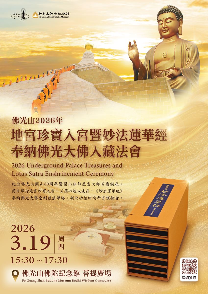 紀念佛光山開山60周年暨開山祖師星雲大師誕辰,謹訂於2026年3月19日下午3:30,吉日良時,佛光山供奉《妙法蓮華經》,奉納佛光大佛金剛座,於佛光山佛陀紀念館,舉行「佛光山2026年地宮珍寶入宮暨《妙法蓮華經》奉納佛光大佛入藏法會。