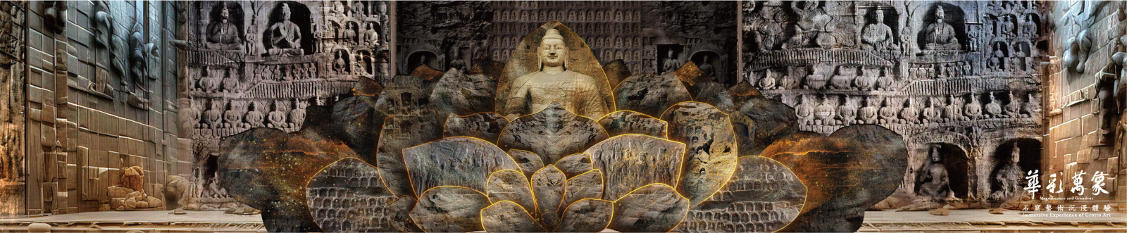 石窟藝術沉浸體驗旨在以當代眼光挖掘和闡釋中國石窟藝術,應用數位建模、AI演算法、數位交互應用等技術,對石窟藝術特點的經典美學元素進行藝術再創作。諸多石窟藝術場景經過當代美學概念的提煉和催化,或莊嚴神聖、或瑰麗曼妙,在這裡一起跨越時空、匯聚一堂,在不斷融合中獲得新生。數位影像與實體展品的結合展示,創新了藝術表達和解析方式,讓文化遺產在時代變革中煥發新的生命力。