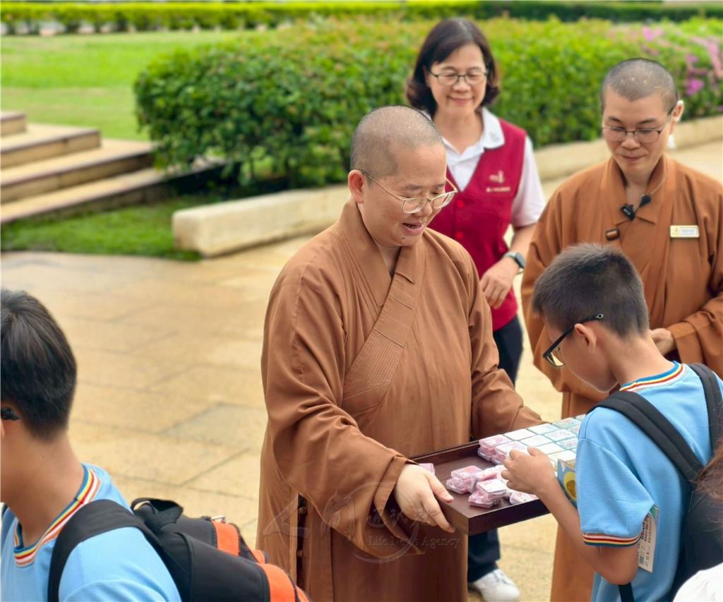 圖說:佛陀紀念館館長如常法師致贈均頭小朋友精美的卡通造型自動筆、橡皮擦。圖/均頭中小學提供