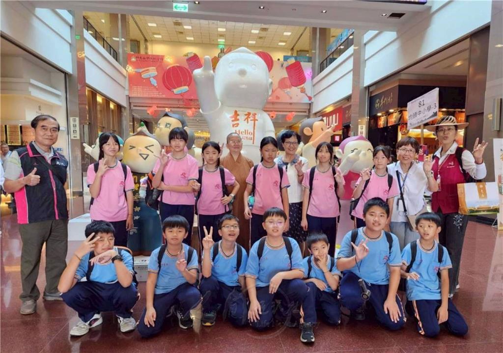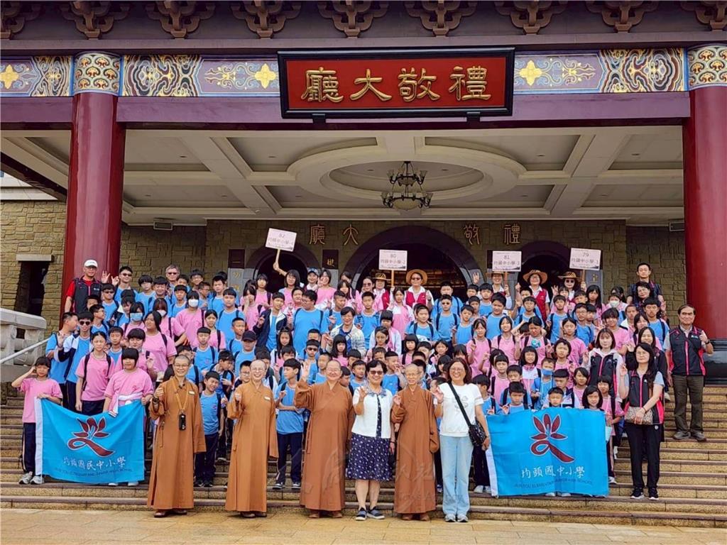 圖說:佛陀紀念館館長如常法師開心和均頭六年級師生合影。圖/均頭中小學提供