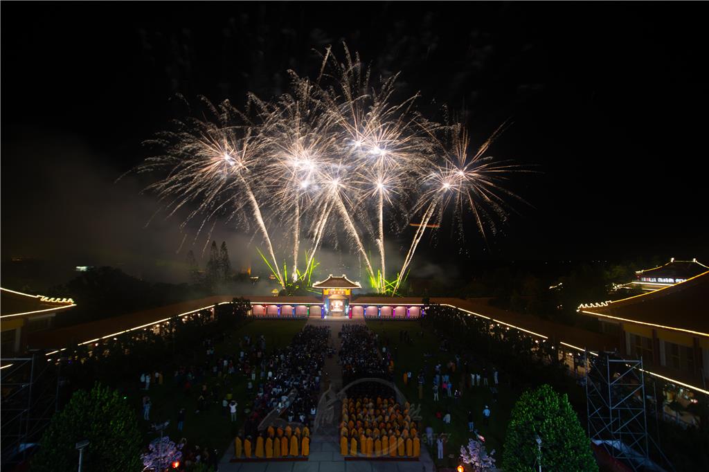 「傳燈六十‧百年仰望」佛光山開山60年,大師以人間佛教宏願讓佛法傳遍全球。全球道場在五大洲拔地而起,如萬盞燈塔照亮世人心田。以及大師給予大家今年的祝福「和諧共生‧馬到成功」,在迎接新年之際,祈願「佛光普照三千界,法水長流五大洲」。最後是燦爛四射的煙火,在眾人的讚歎歡呼中圓滿。