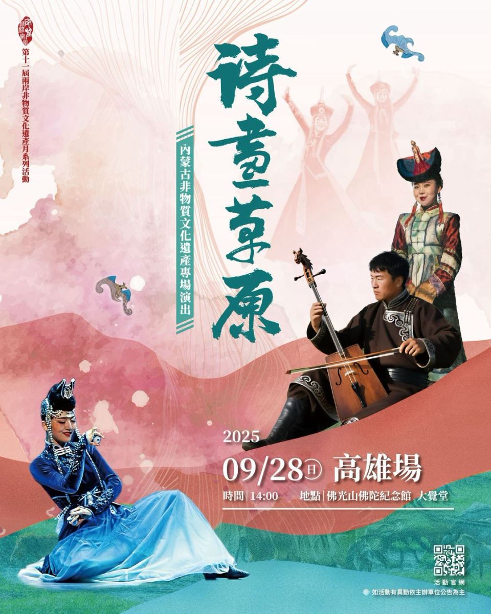 非物質文化遺產「來自於生活,生長於民間」,其精神與價值蘊含著世代累積的智慧與情感。此次活動由中華文化聯誼會、內蒙古自治區文化和旅遊廳、財團法人人間文教基金會、社團法人中華八方文化交流協會共同主辦,透過精心策劃的展覽與演出,呈現內蒙古豐富多樣的文化風貌。期能帶給觀眾的不僅是一場跨越千里的藝術饗宴,更期待推動非遺文化的保存與傳承。誠摯邀請您一同走入草原的詩與藝,感受文化傳承的動人力量。
