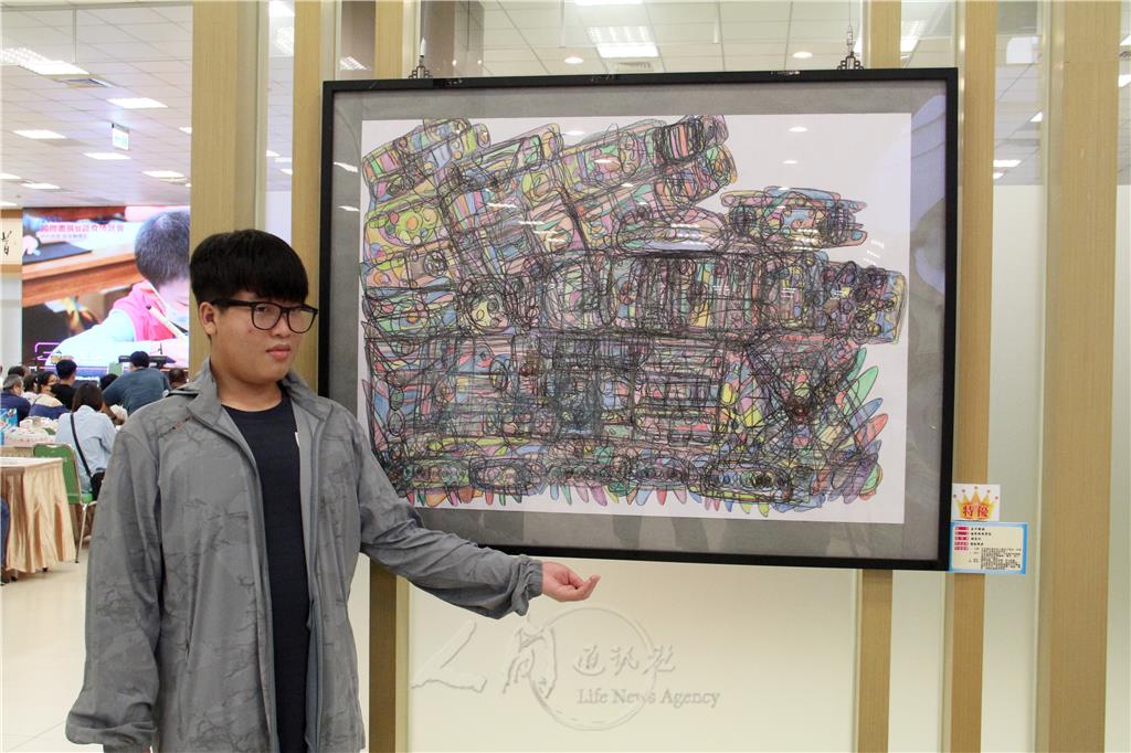 圖說:高中職組特優楠梓特殊學校謝秉均,與作品〈超級戰車〉。圖/人間社記者李生鳳