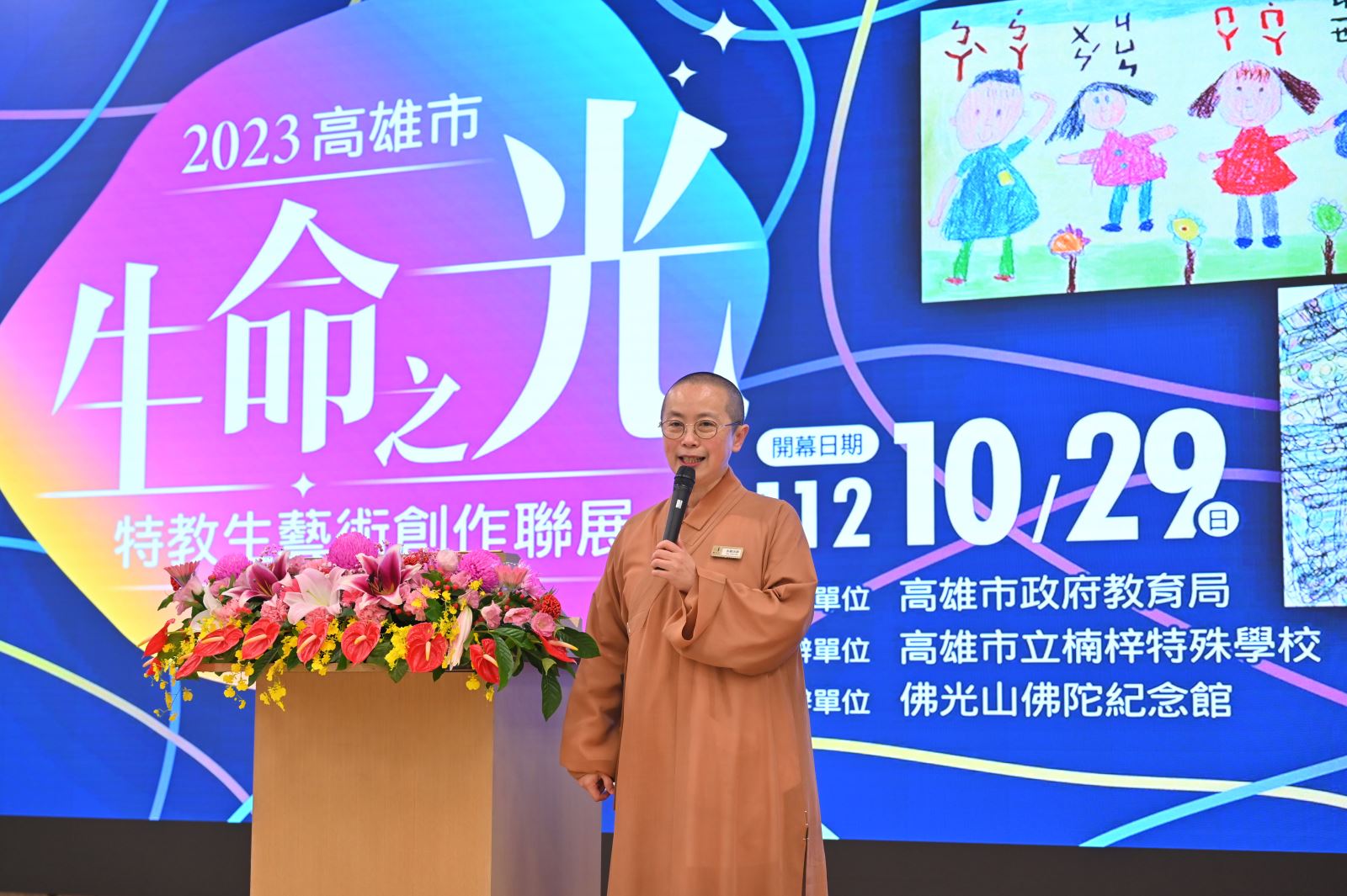 圖說:佛陀紀念館副館長永融法師表示,感謝「高雄市特教生藝術創作聯展」每年在佛館展出,以及說明即將展開的「2023國際書展暨蔬食博覽會」。圖/佛光山佛陀紀念館