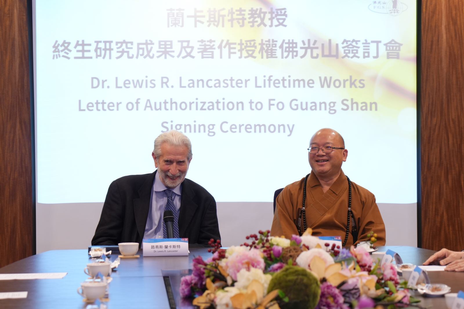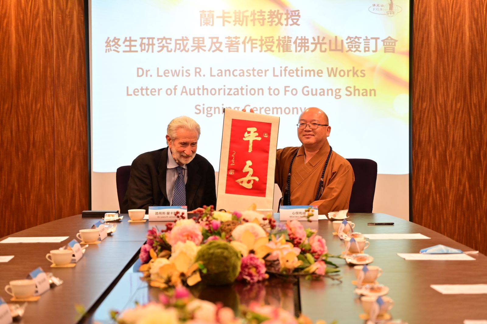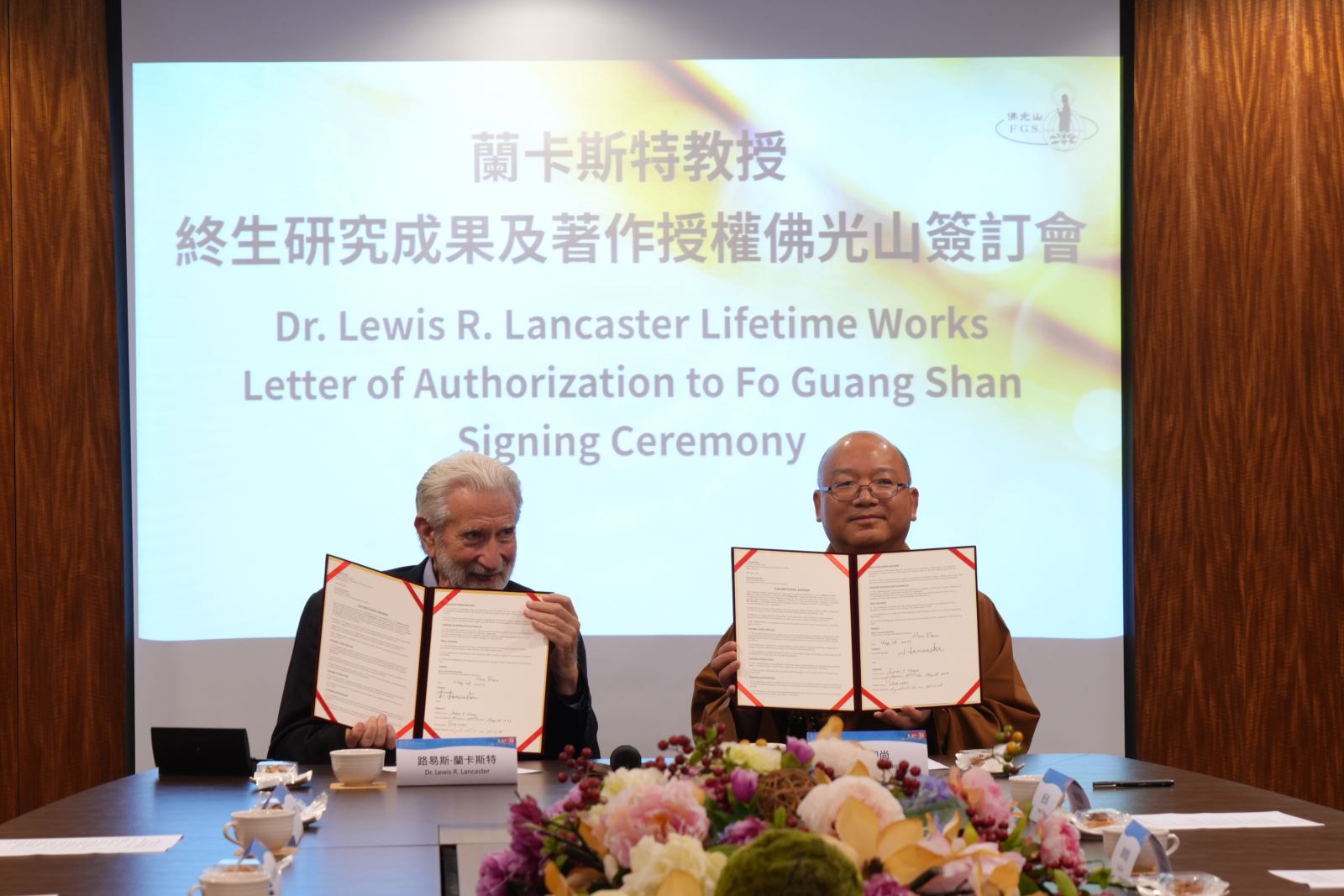 「蘭卡斯特教授終生研究成果及著作授權佛光山簽訂會」5月28日下午於佛光山佛陀紀念館佛光樓二樓會議室舉行,由美國柏克萊加州大學終身榮譽教授蘭卡斯特(Dr. Lewis R. Lancaster)及佛光山住持心保和尚代表簽署。