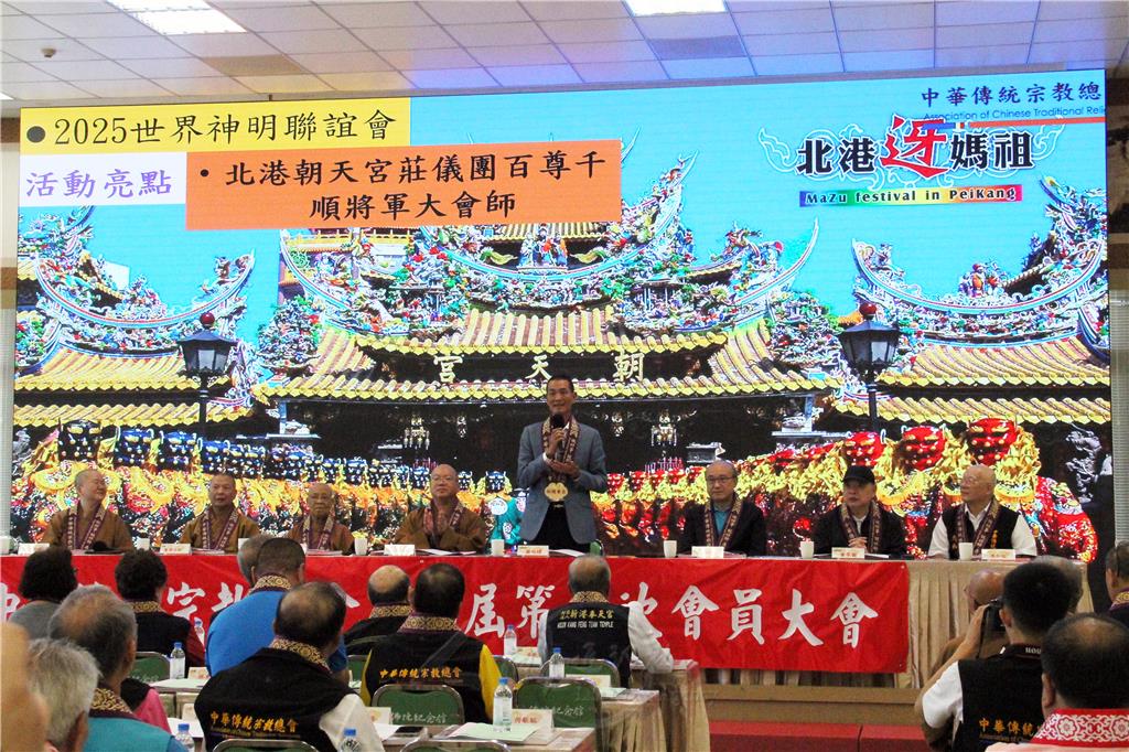 圖說:中華傳統宗教總會副總會長北港朝天宮董事長蔡咏鍀(右4),介紹2025世界神明聯誼會亮點之一「北港朝天宮莊儀團百尊千順將軍大會師」。圖/人間社記者李生鳳