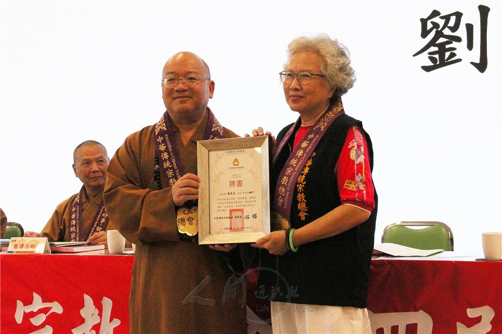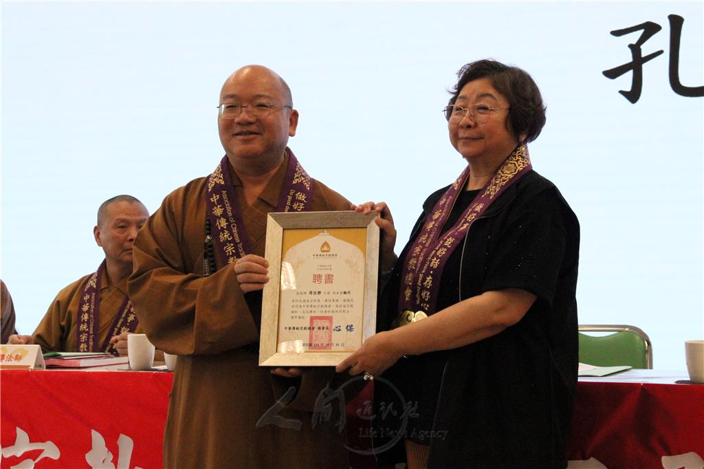 圖說:中華傳統宗教總會總會長心保和尚(左),頒發顧問聘書予孔美蓉(右)。圖/人間社記者李生鳳