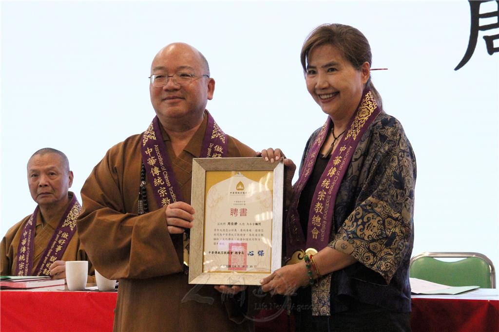 圖說:中華傳統宗教總會總會長心保和尚(左),頒發顧問聘書予周佳靜(右)。圖/人間社記者李生鳳
