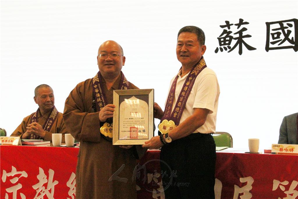 圖說:中華傳統宗教總會總會長心保和尚(左),頒發顧問聘書予蘇國課(右)。圖/人間社記者李生鳳