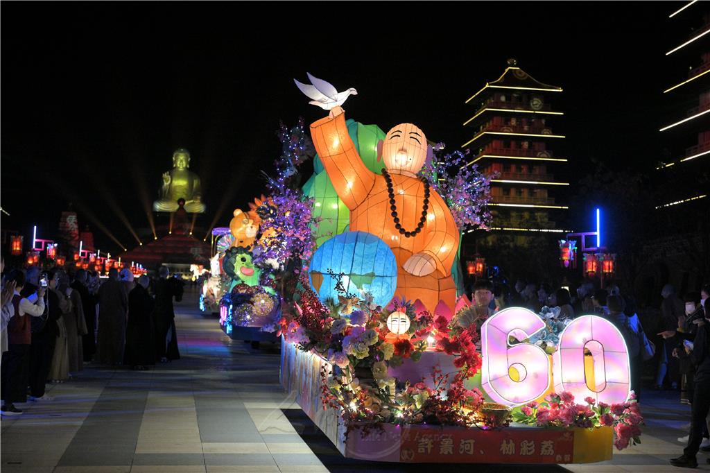 「光照大千」演出圓滿後,隨即是「三好嘉年華花車遊行」,當花車在夜間亮起,更加璀燦閃亮。今年共12台花車和大家結緣,花車造型應景傳統又創新,還有乘著馬車的佛陀,讓人眼睛為之一亮。