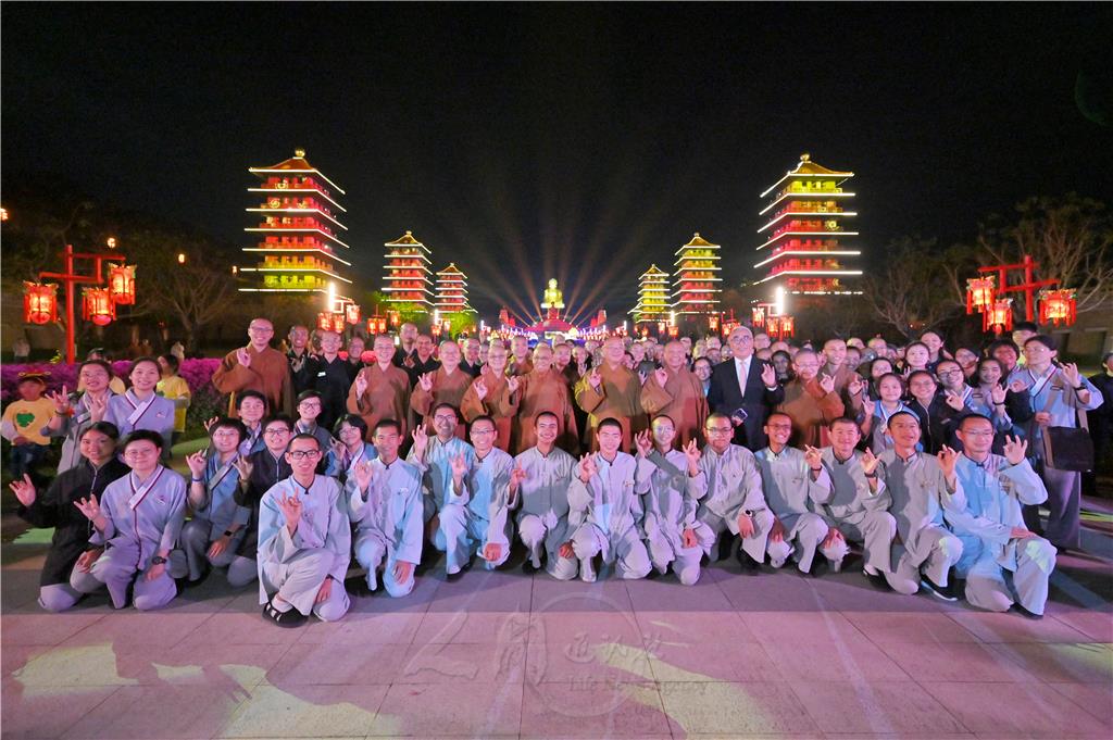 圖說:佛光山住持心保和尚(站立第一排左5)、國際佛光會署理會長慈容法師(站立第一排左4)、佛光山常務副住持慧傳法師(站立第一排左6)、佛光山佛陀紀念館館長如常法師(站立第一排左2),偕同大眾歡喜欣賞「光照大千」。人間社記者趙啟超攝